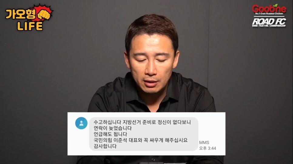 지난달 28일부터 로드FC 정문홍 회장이 개인 유튜브 채널 ‘가오형 라이프’를 통해 정치인들의 격투기 대결 지원자를 모집하고 있다. 정문홍 회장은 우리나라 거대 양당인 국민의 힘과 더불어 민주당이 서로를 무조건 싫어하는 것 같다며 로드FC 케이지에서 대결하는 것을 제안했다.