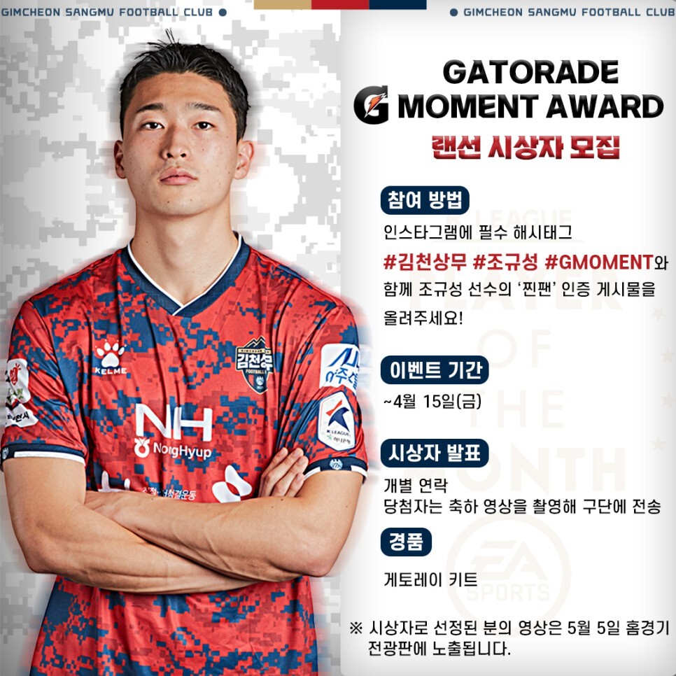 한편, 김천상무는 15일(금)까지 인스타그램을 통해 조규성의 랜선 시상자를 모집한다. 김천상무, 조규성, GMOMENT를 해시태그를 포함해 인스타그램 게시물에 올리면 응모가 완료되며, 당첨자의 축하 영상은 내달 5일 김천상무 홈경기 시 전광판을 통해 노출될 예정이다.